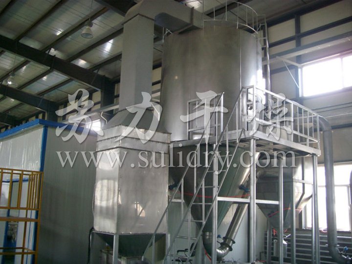 空氣經(jīng)過濾和加熱,進(jìn)入干燥器頂部空氣分配器,熱空氣呈螺旋狀均勻地進(jìn)入干燥室。料液經(jīng)塔體頂部的高速離心霧化器,(旋轉(zhuǎn))噴霧成極細(xì)微的霧狀液珠,與熱空氣并流接觸在極短的時(shí)間內(nèi)可干燥為成品。成品連續(xù)地由干燥塔底部和旋風(fēng)分離器中輸出,廢氣由風(fēng)機(jī)排空。